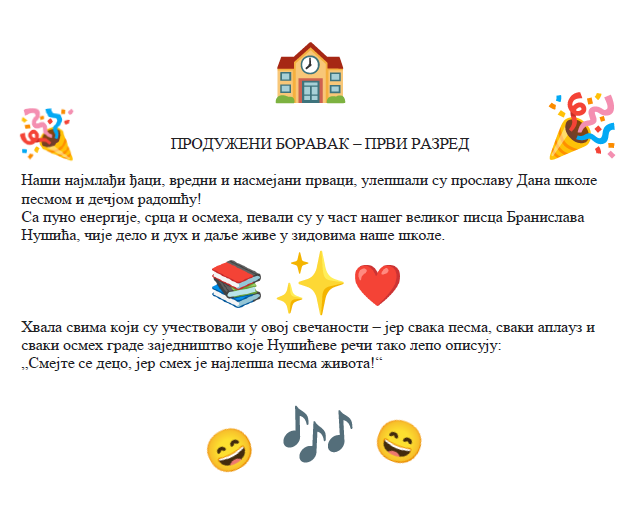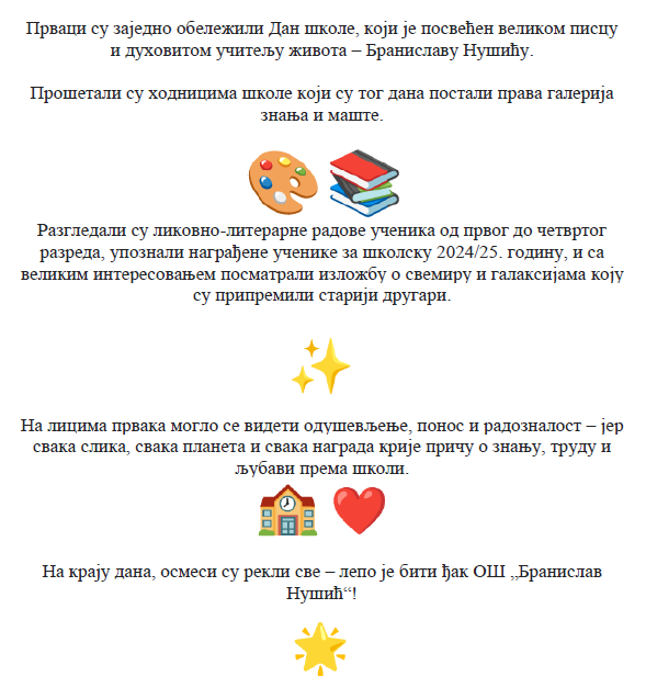 Осмог октобра испред главног улаза уз химну и подизање школске заставе започела је свечаност прославе Дана школе.Уз присуство ученика, родитеља и запослених директорка је поздравила све присутне, а ђаку генерације шк. 2024/2025. године Милошу Паприци и награђеним ученицима овогодишњег ликовно-литерарног конкурса уручила пригодне поклоне.